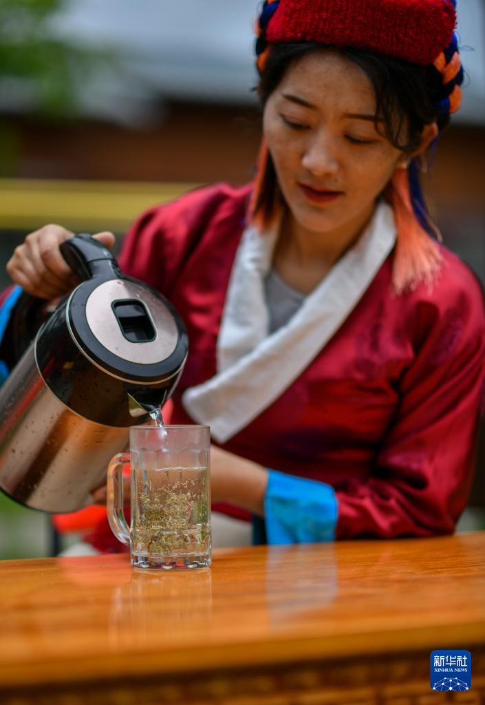 错那市贡日门巴民族乡斯木村第一书记尼玛卓玛在沏泡莓茶(7月28日摄)。