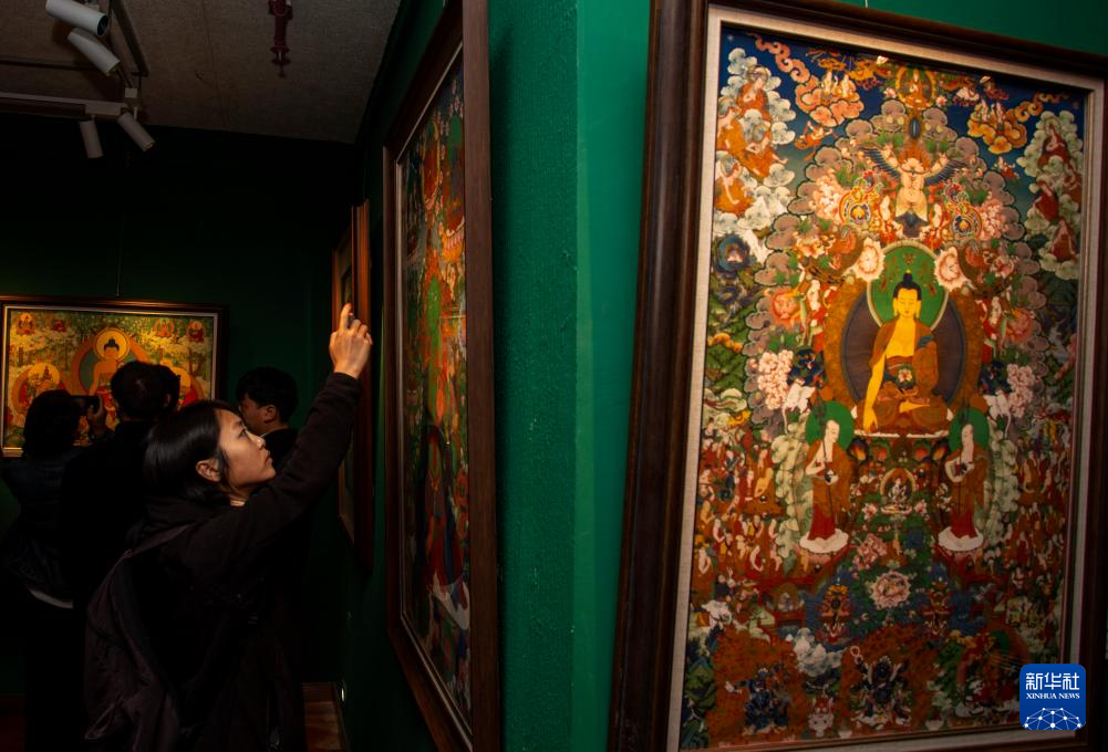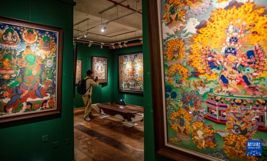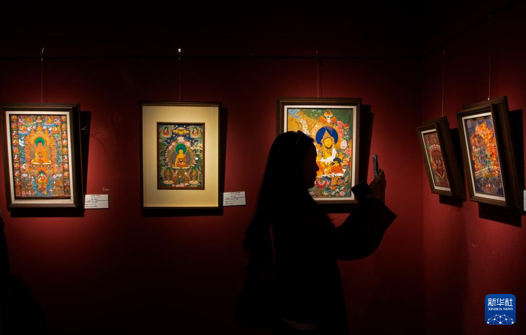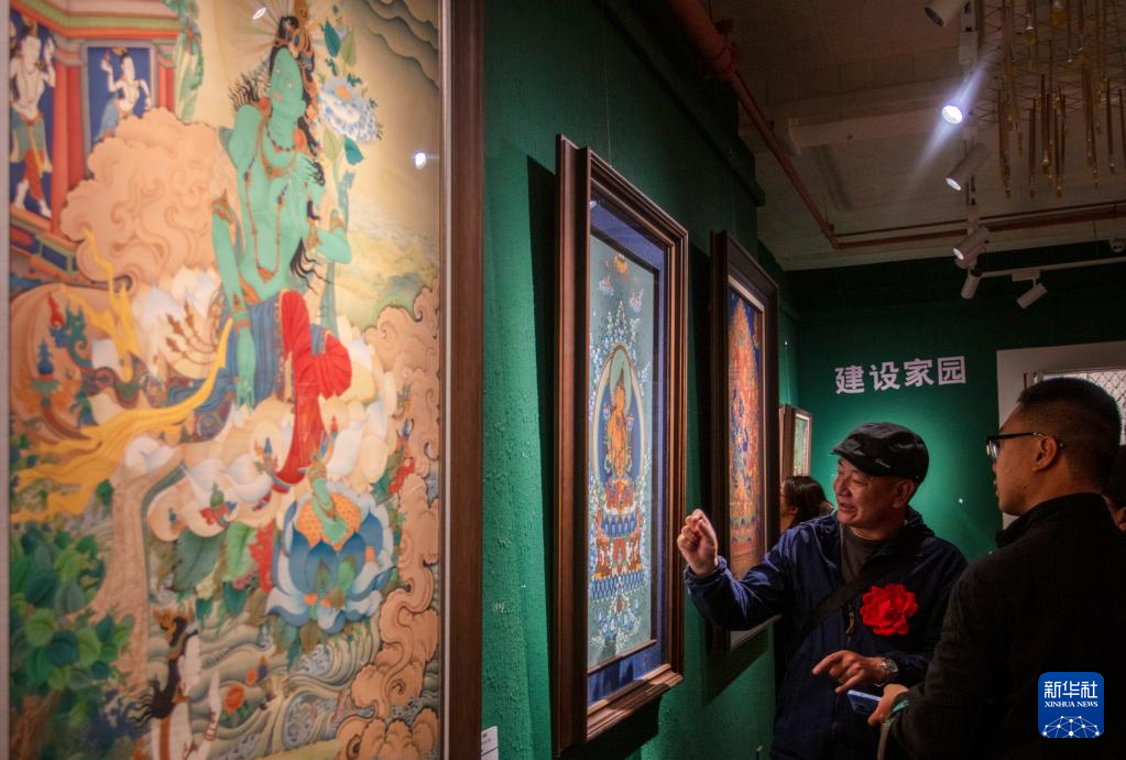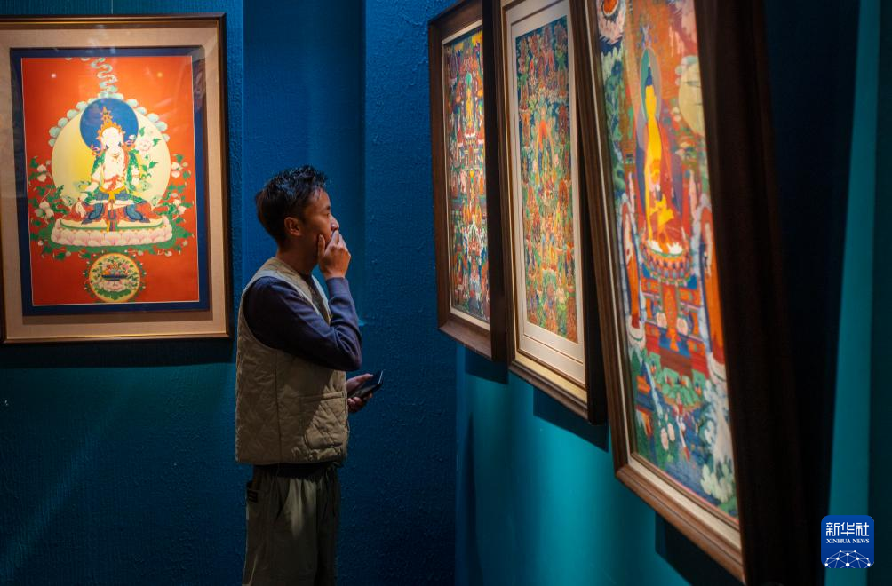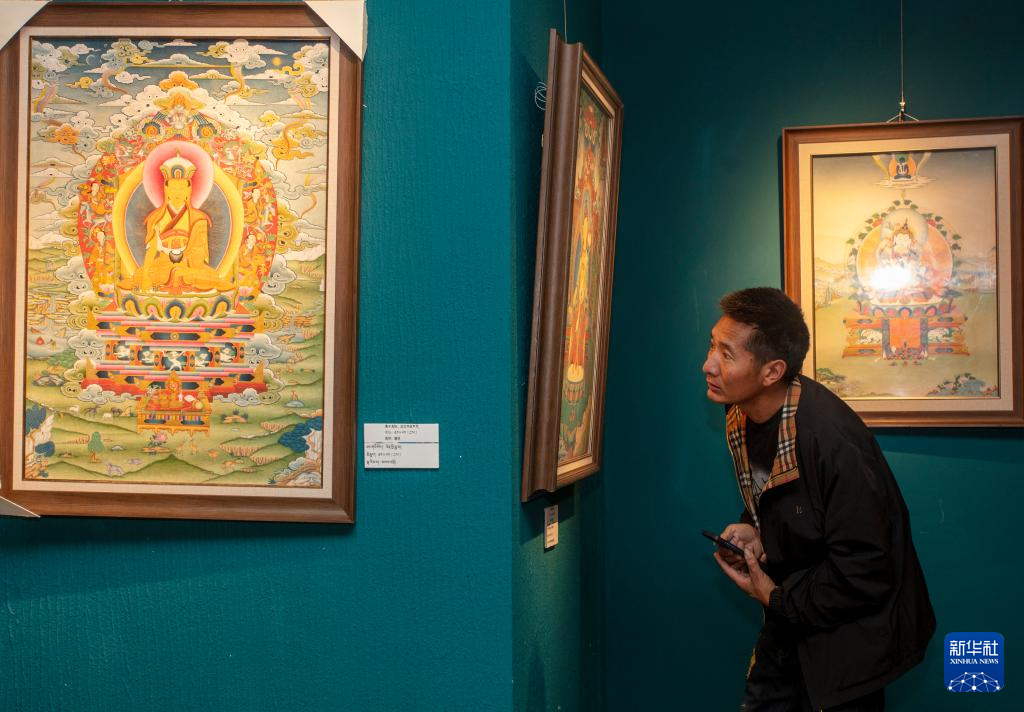 9月28日,观众在展览上欣赏唐卡。新华社记者 姜帆 摄