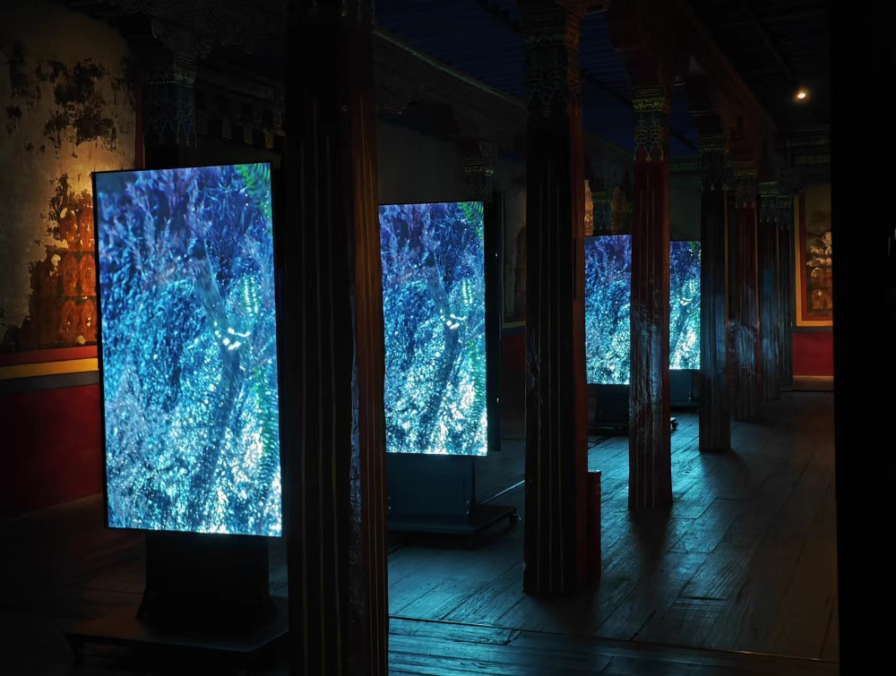 在历时数月的精心筹备之后,13位/组艺术家创作的装置、新媒体、声音艺术作品得以在这座“回”字形结构的古建筑中呈现。在“回”字的外廊,藏族导演卡布的影像作品记录下来自大地的古老声音,给观众带来别样的体验。
