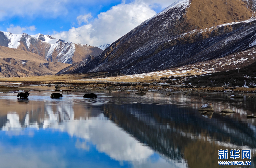 12月10日,在嘉乃玉错湖边拍摄的牦牛。新华网 旦增努布 摄
