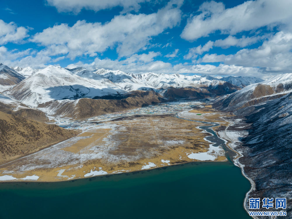 嘉乃玉错与不远处的嘉黎县县城(12月10日摄,无人机照片)。新华网 旦增努布 摄