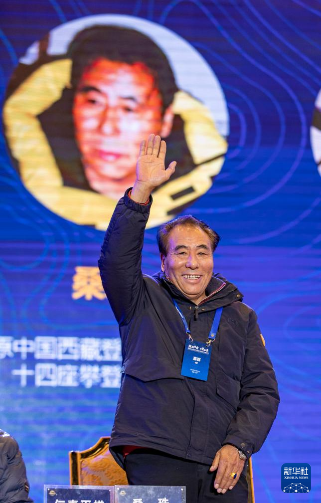 12月11日,原西藏登山队登顶世界十四座海拔8000米以上高峰探险队队长桑珠在交流大会上向观众致意。新华社记者 姜帆 摄