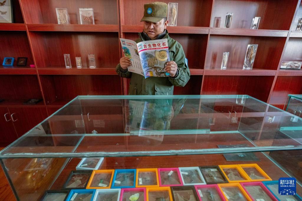 格桑伦珠在站里收集的化石标本前看书(12月21日摄)。新华社记者 姜帆 摄