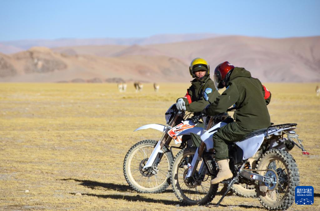 巡护队员们骑着摩托巡护(12月17日摄)。新华社记者 刘文博 摄