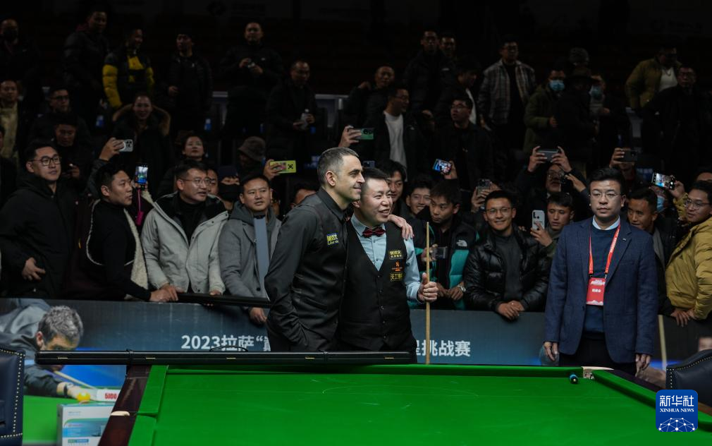 2023年12月31日,罗尼·奥沙利文(左)和耿渊(右)在赛后合影。新华社记者 晋美多吉 摄