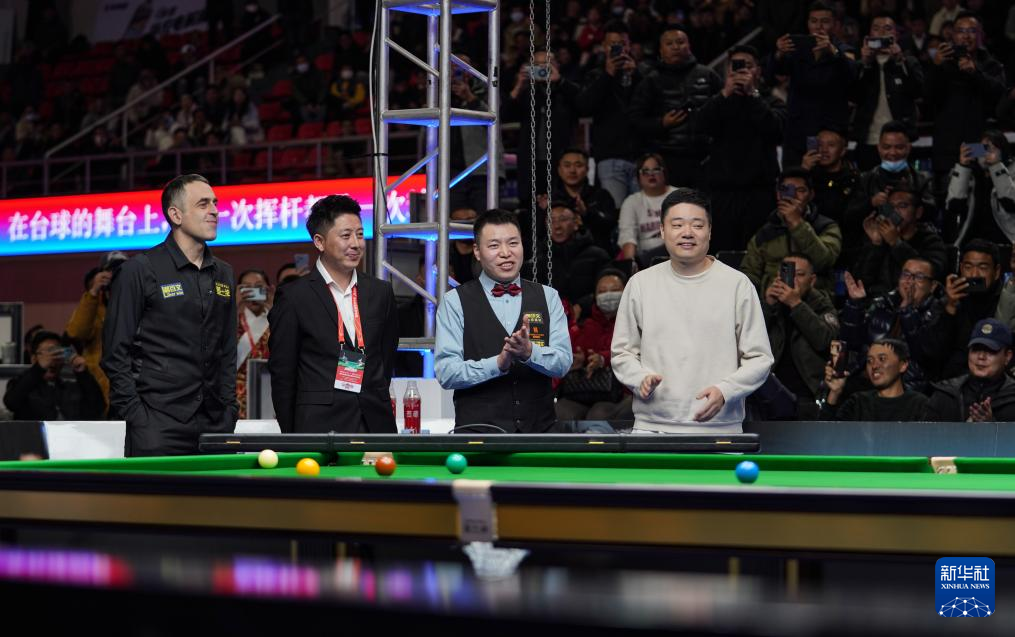 2023年12月31日,罗尼·奥沙利文、伍金多吉、耿渊和丁俊晖(从左至右)在赛前和观众互动。新华社记者 晋美多吉 摄