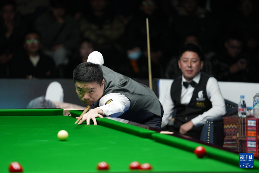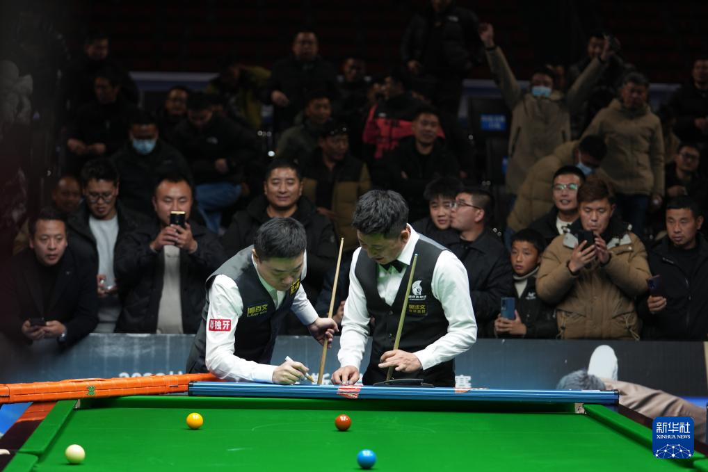 2023年12月31日,丁俊晖(左)与伍金多吉在比赛中。新华社记者 晋美多吉 摄