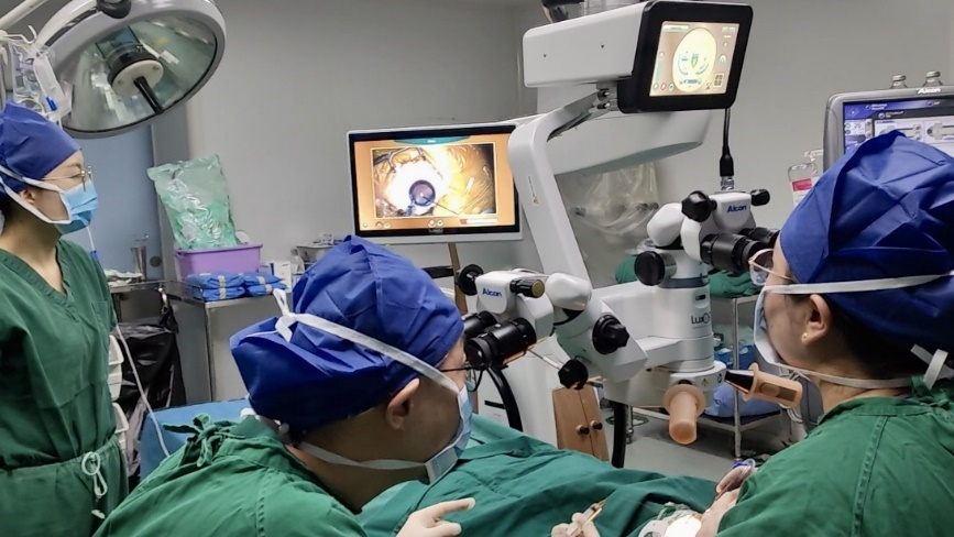 范翔主刀,通过一个仅0.4mm的超微创切口,清除病灶,打开小欧珠眼睛的光学通路。手术历时15分钟,顺利完成,并且无需缝合,避免后续再次手术拆线。