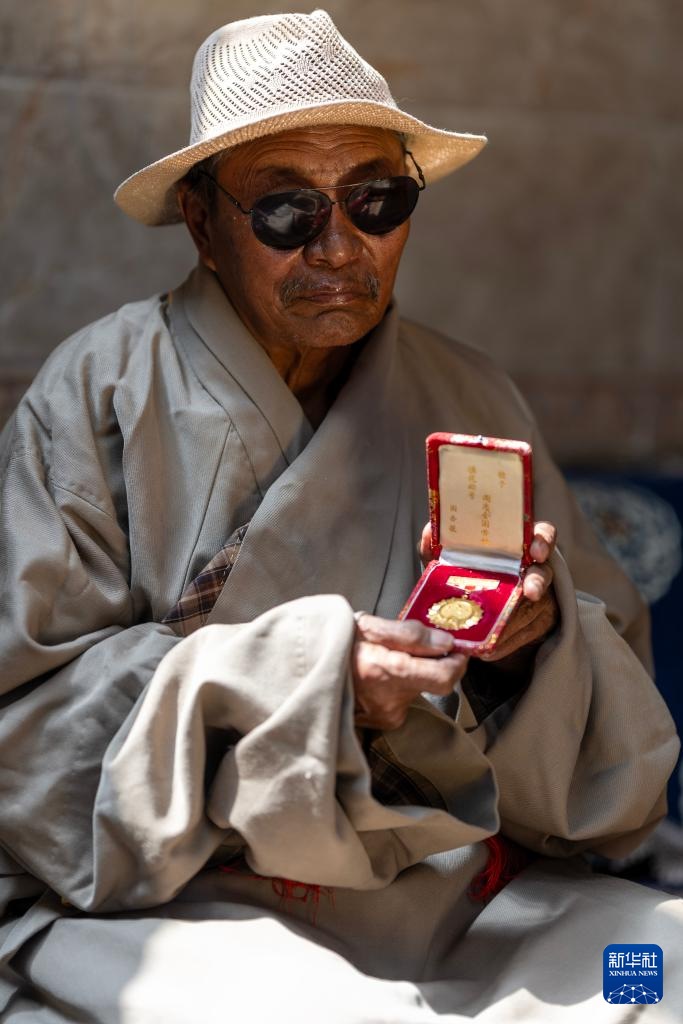 白玛老人展示自己的全国劳动模范奖章(3月27日摄)。新华社记者 姜帆 摄