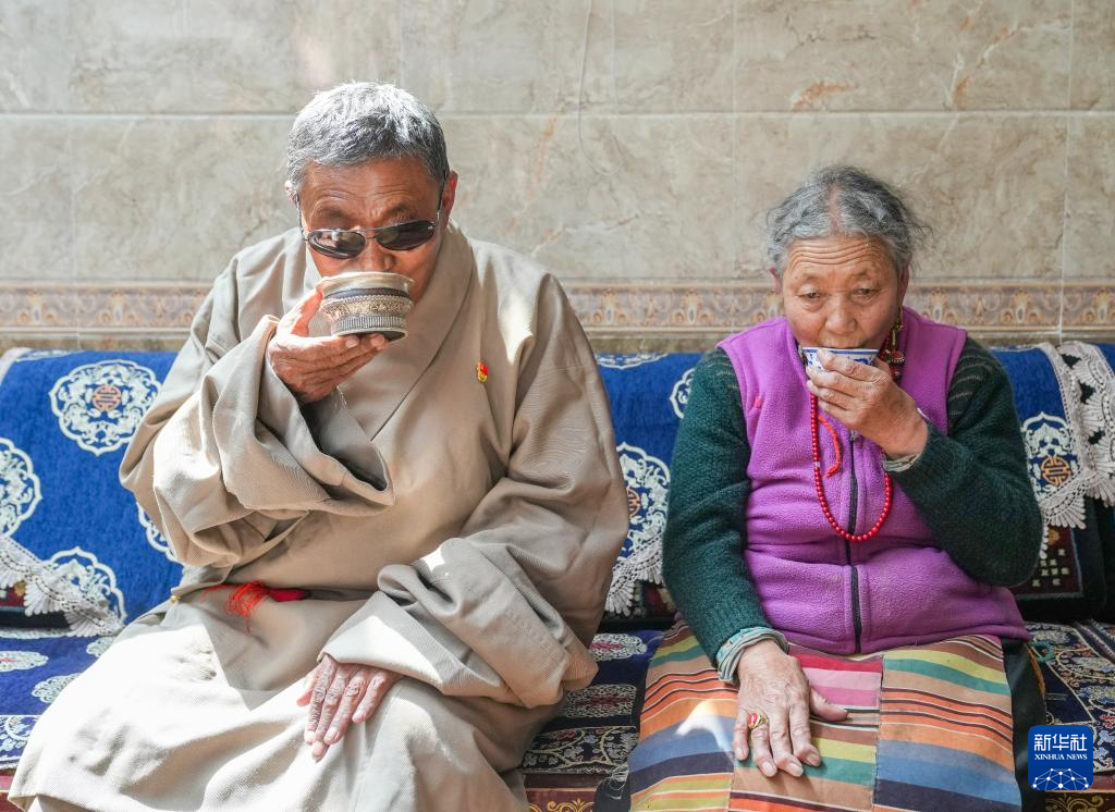 白玛老人(左)和老伴多吉卓玛在家中喝酥油茶(3月27日摄)。新华社记者 丁汀 摄