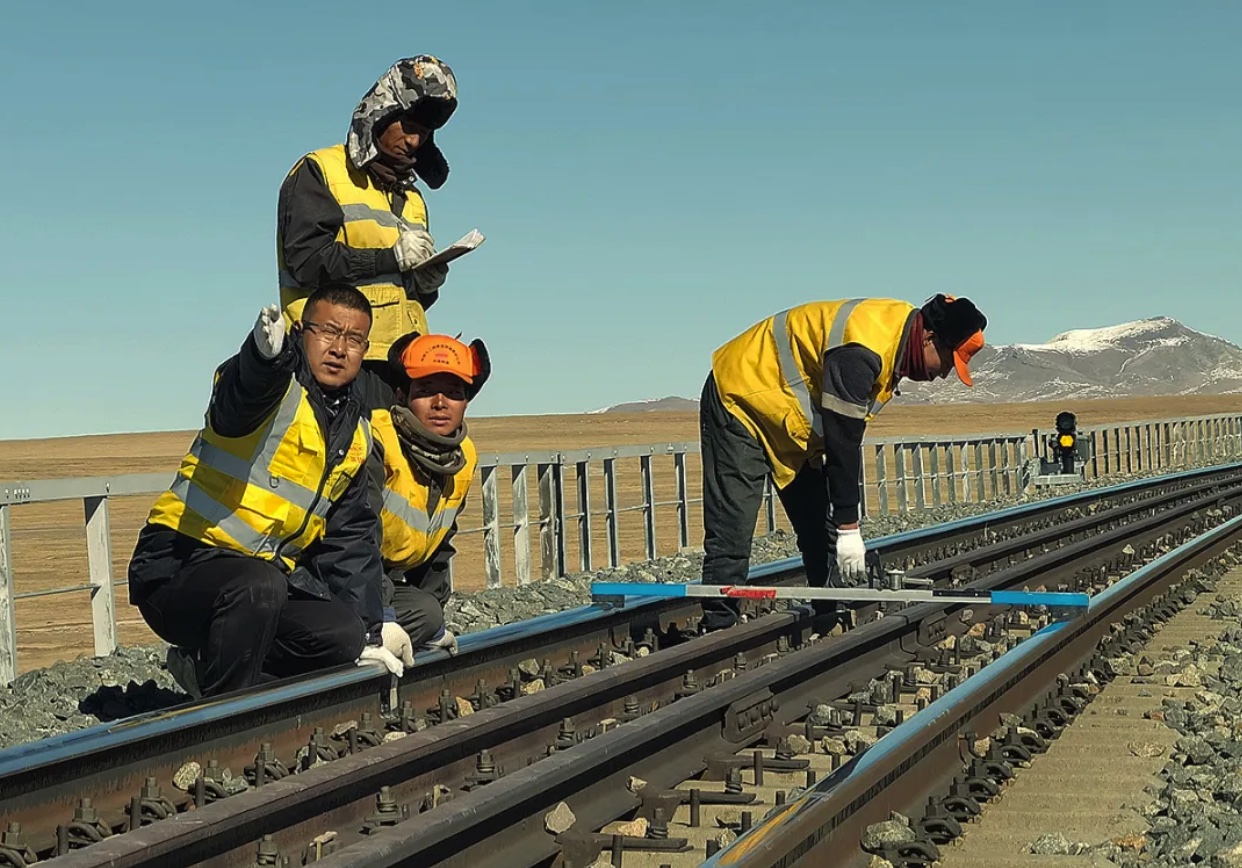 高钱胜(左一)和他的团队在多年冻土区段进行路基病害整治和检查