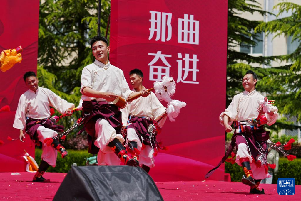 5月12日,在西藏职业技术学院职业教育活动周启动仪式暨比如县非物质文化遗产进校园活动上,比如县民族艺术团的演职人员在表演节目。新华社发(赵大志摄)