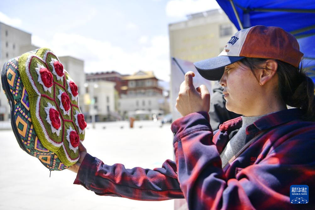 5月12日,在西藏职业技术学院职业教育活动周启动仪式暨比如县非物质文化遗产进校园活动上,一名消费者在挑选比如县的特色旅游产品。新华社记者 张汝锋 摄