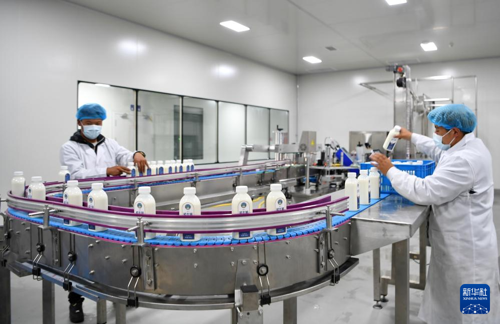 嘎确生态畜牧业发展有限责任公司的工人在牛奶生产流水线上工作(8月24日摄)。新华社记者 张汝锋 摄