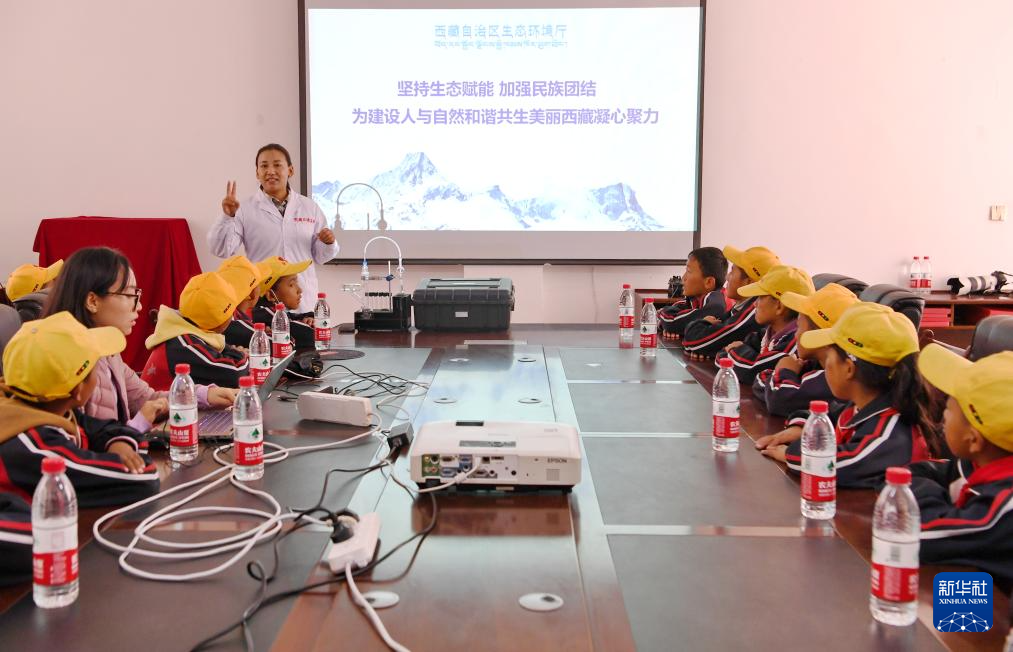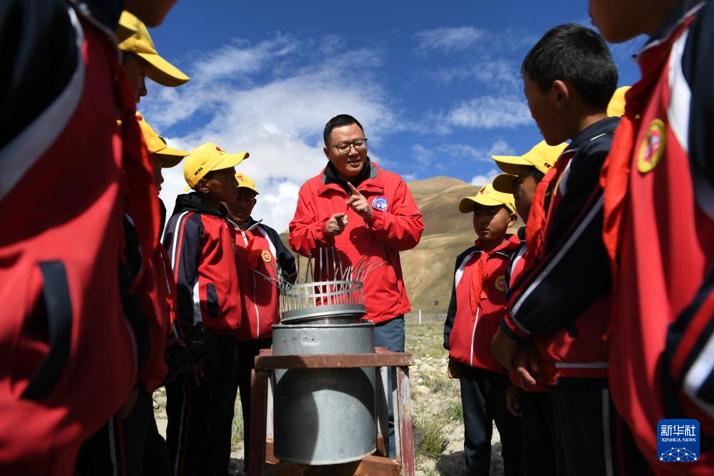 9月5日,在珠穆朗玛大气与环境综合观测研究站,西藏自治区生态环境监测中心工程师索娜卓嘎为学生们科普生态环境监测意义。新华社记者 张汝锋 摄