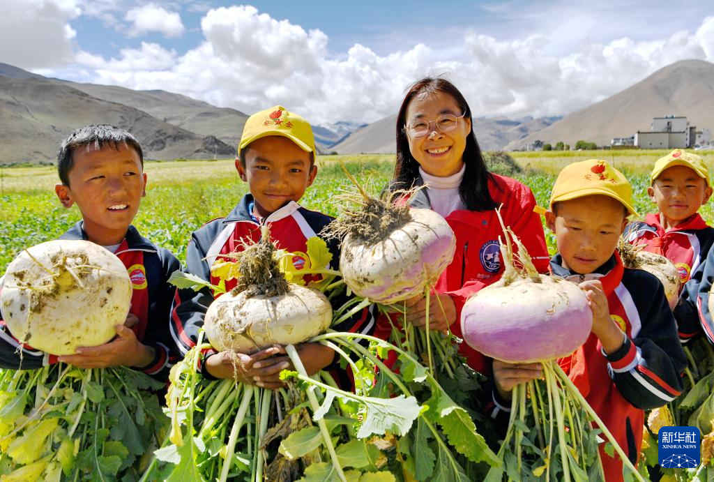 9月5日,在珠峰脚下的田地里,中国科学院青藏高原研究所副研究员、中国生态学学会高寒生态专业委员会委员姜丽丽(中)和学生们一起展示收获的芜菁。新华社记者 张汝锋 摄