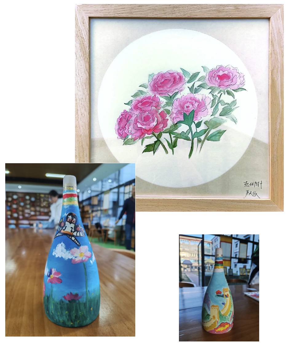 燕化附中学生罗天依等三位同学与北实绘画小组成员一起在画纸、花瓶上绘制长城、沙燕、群山、白云,让北京市花月季花与拉萨市花格桑花一起绽放。