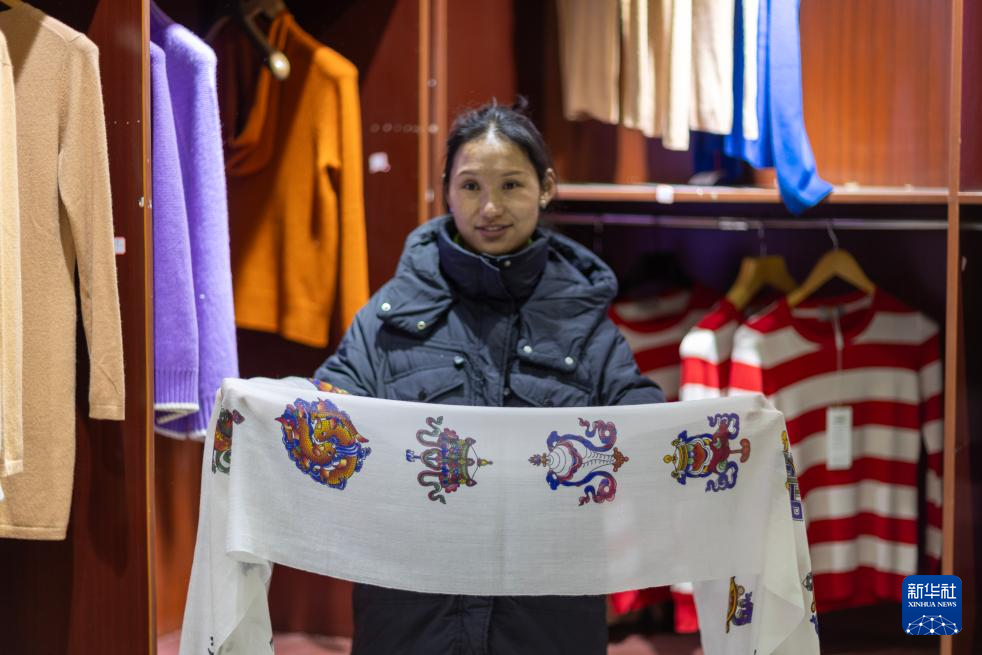 措勤县的销售人员在展示用紫山羊绒为原料制作的印有八宝图案的哈达(11月20日摄)。新华社记者 姜帆 摄
