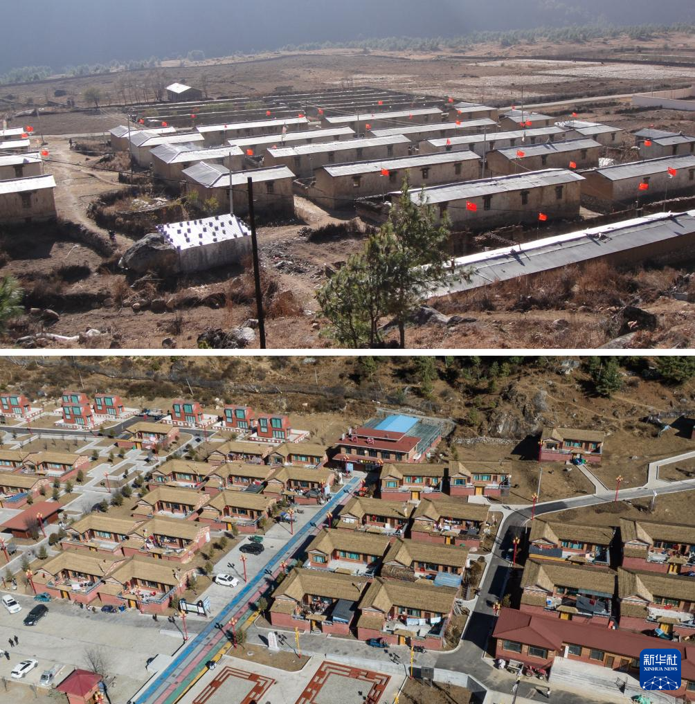 拼版照片,上图为:2005年拍摄的达曼新村(新华社发);下图为:2024年12月15日拍摄的达曼新村(无人机照片,新华社记者丁增尼达摄)。新华社发