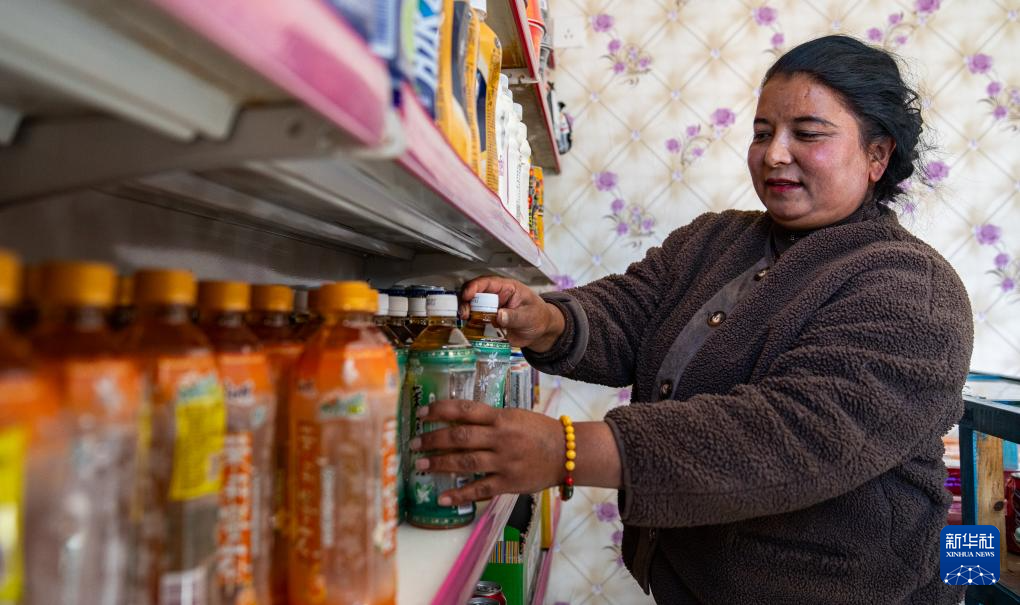 12月15日,一名达曼新村的妇女在自家商店里整理货架。新华社记者 丁增尼达 摄