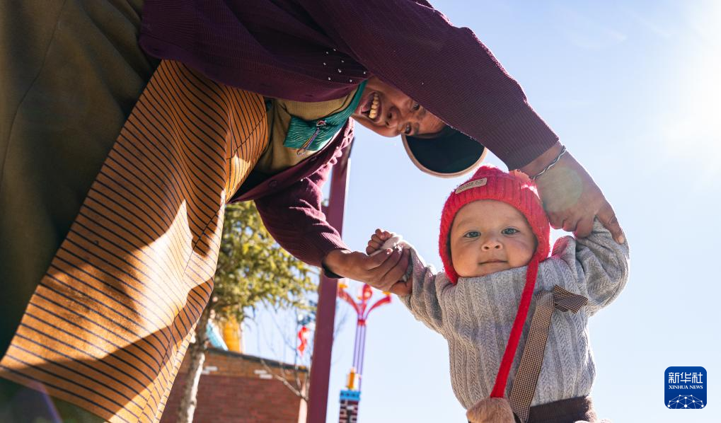 12月15日,达曼新村的一名妇女在教孩子走路。新华社记者 丁增尼达 摄