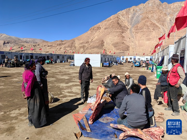 在距离震中18公里的曲洛乡热木青村,一排排活动板房围成了一个温馨的大院,村民们聚居一堂。有的村民正手持脸盆,轻轻洒水,以防扬尘四起;有的则忙着分发捐赠的牛羊肉,每户可以分到10斤以上;有的则坐在板房外的椅子上,把洗过的头发晒干。