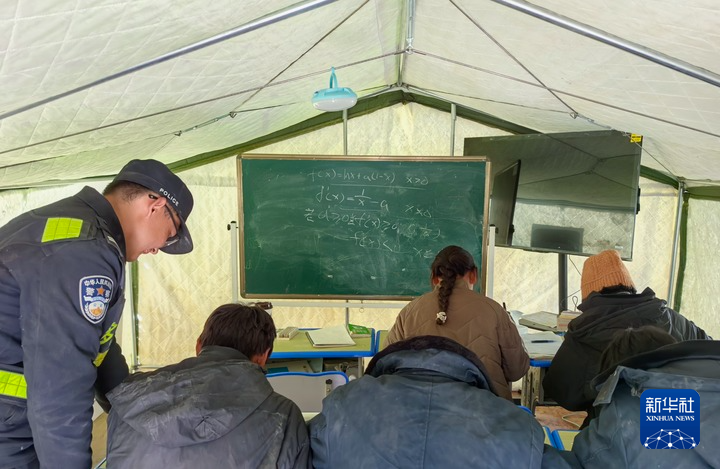 “大家看一下这道题怎么解?”在西藏日喀则市定日县长所乡嘎布村安置点的帐篷内,22岁的刘鑫磊一手指着黑板上的题目,一手拿着资料,耐心地给村里的高三学生讲解。
