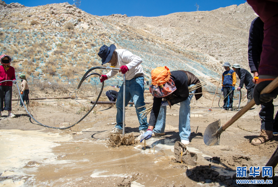4月24日,在拉萨南北山造林绿化(贡嘎段)2号片区,当地村民在栽树。新华网 旦增努布 摄