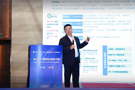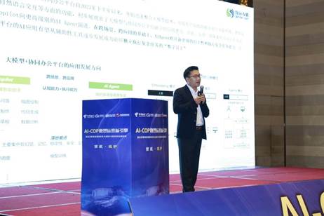 致远互联客户经营事业部总经理张浩展示政企AI融合创新成果:基于“1基座+2引擎+4统一”打造快速接入的企业智脑AI基座,构建了票据智审、数字机关等场景化解决方案。