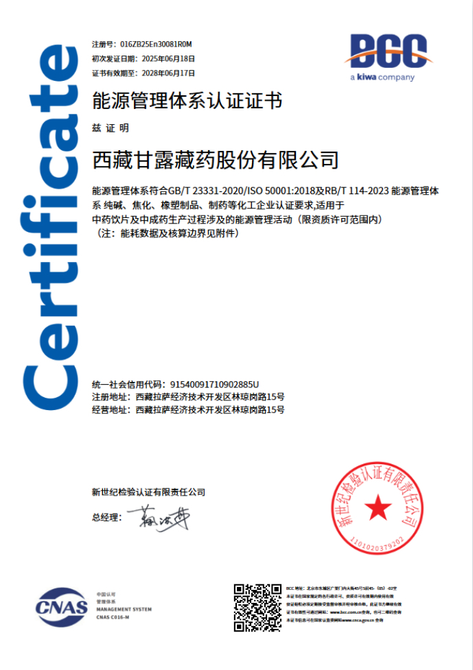 此次认证,不仅是对甘露藏药能源管理能力的权威认证,更标志着该公司在精细化、智能化能源管理领域实现突破,为拓展国内外市场增添绿色发展新标识。公司表示,将持续优化能源管理体系,加速推进清洁生产技术升级,着力构建低碳生产模式,为行业绿色低碳发展树立示范样板。