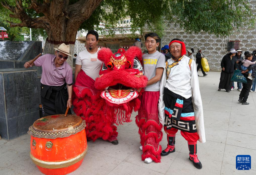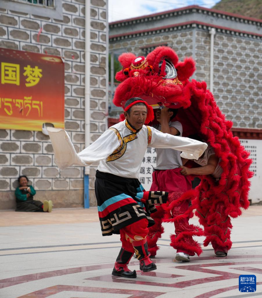 硕督镇群众在表演硕督狮子舞(7月21日摄)。新华社记者 晋美多吉 摄