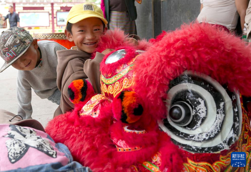 小朋友观看硕督狮子舞的演出道具(7月21日摄)。新华社记者 晋美多吉 摄
