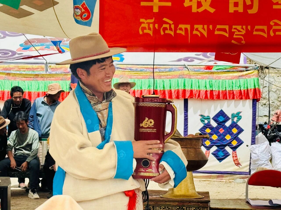 群众身着盛装,脸上洋溢着幸福的笑容,有序地领取这份承载特殊意义的礼物。一件件纪念品发放到群众手中,每份纪念品都承载着党中央的关怀和全国人民的深情厚谊。据介绍,此次发放的全自动茶壶是首批到达南木林县的纪念物资,不仅是对西藏60年发展成就的生动见证,更凝聚着对基层群众的贴心关怀。现场群众手捧饱含深情的纪念品,脸上绽放着幸福的笑容,一声声真挚的感慨传递着对党中央的感恩之情。