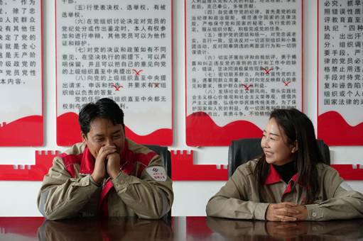 泽久贡布(左一)和张永莲(右一)在接受访谈时相视一笑。新华网发 李沁阳摄