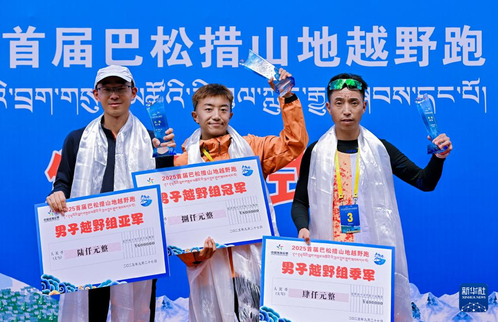 9月27日,30公里越野男子组冠军桑珠(中)、亚军侯华斌(左)和季军普布顿珠在颁奖仪式上。新华社发