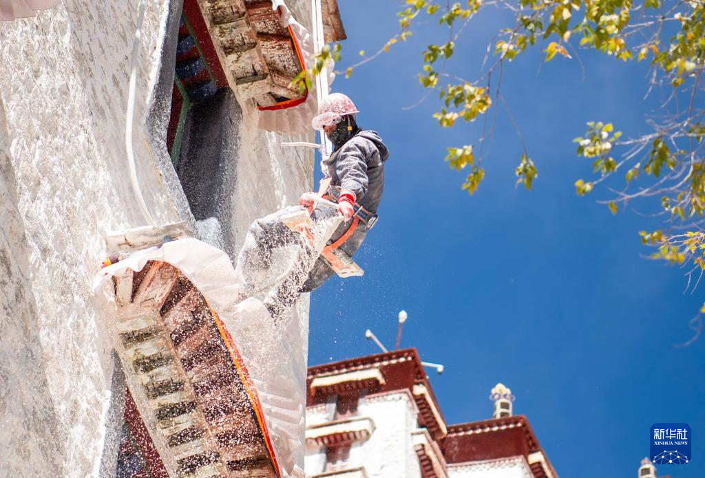 近日,西藏布达拉宫迎来一年一度的粉刷“美容”。工作人员和志愿者将粉刷材料按比例混合,经过滤后对布达拉宫墙体进行喷涂,让建筑更加美观。