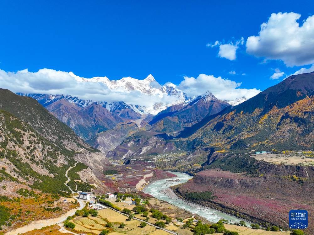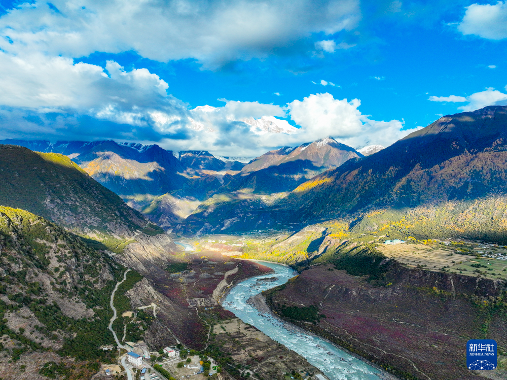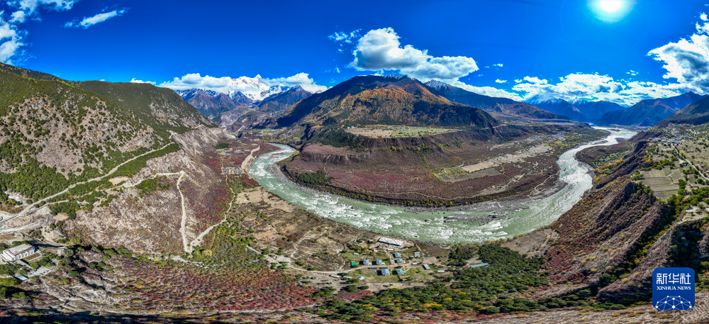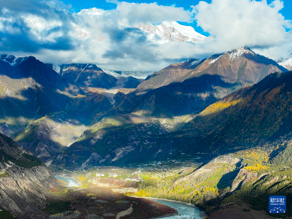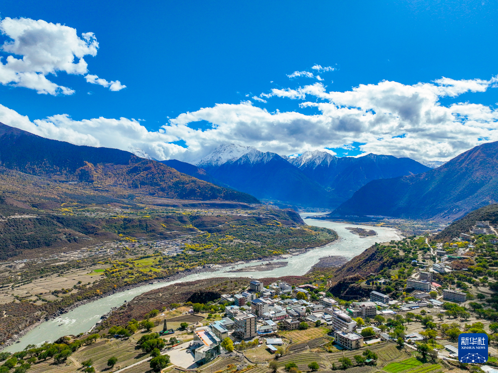 深秋时节,在西藏林芝市米林市派镇雅鲁藏布大峡谷,蜿蜒的雅鲁藏布江如碧绿的丝带穿行于险峻峡谷间,与远处巍峨的雪山相互映衬,壮美如画。