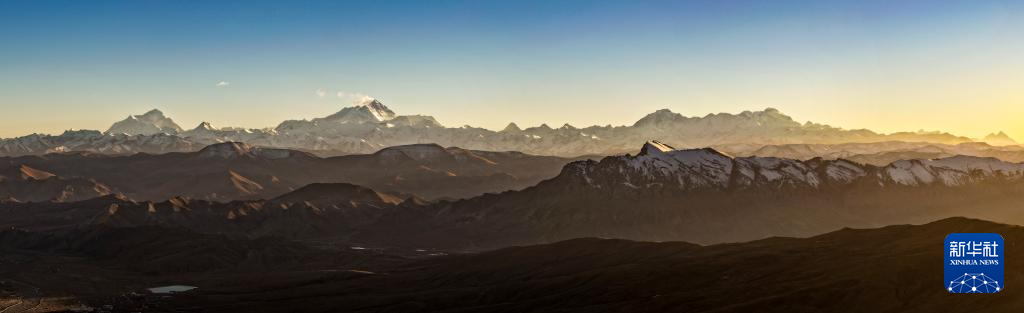 11月13日黄昏在定日县拍摄的喜马拉雅山脉,自左至右的高峰分别是洛子峰、珠穆朗玛峰、卓奥友峰和希夏邦马峰(无人机照片)。新华社记者 姜帆 摄