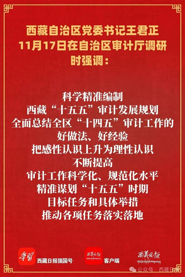 王君正强调,要弘扬理论联系实际的学风,紧密结合西藏实际,围绕中心、服务大局,服务保障社会主义现代化新西藏建设不断取得新成效。科学精准编制西藏“十五五”审计发展规划,全面总结全区“十四五”审计工作的好做法、好经验,把感性认识上升为理性认识,不断提高审计工作科学化、规范化水平,精准谋划“十五五”时期目标任务和具体举措,推动各项任务落实落地。聚焦稳定、发展、生态、强边四件大事加强审计监督,坚持问题导向、系统思维,拓展审计监督广度和深度,增强工作的前瞻性、针对性,以高质量审计成果为自治区党委科学决策提供参考。聚焦改善民生、凝聚人心加强审计监督,坚持“三个赋予一个有利于”总要求,把审计力量和资源向基层一线下沉、向群众身边延伸,打通惠民富民政策落实的堵点、难点。聚焦规范权力运行加强审计监督,坚持以党的自我革命引领社会革命,充分发挥审计在反腐治乱方面的重要作用,将严的基调、严的措施、严的氛围长期坚持下去。聚焦问题整改“下半篇文章”加强审计监督,完善审计整改工作机制,扎实抓好中央审计发现问题整改工作,加强审计监督与纪检监察、巡视巡察等各类监督的贯通协同,推动审计发现问题整改落实。
