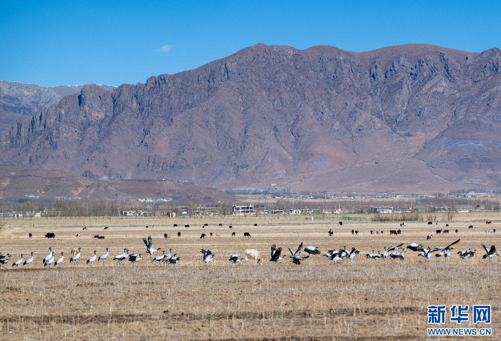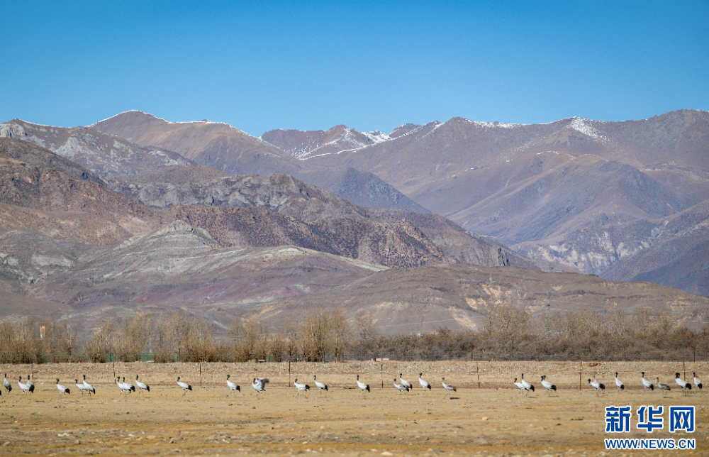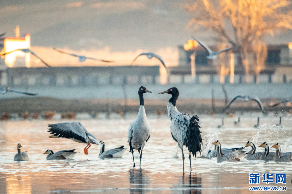 这是11月26日在西藏拉萨市林周县境内拍摄的黑颈鹤和斑头雁。新华网 旦增努布 摄