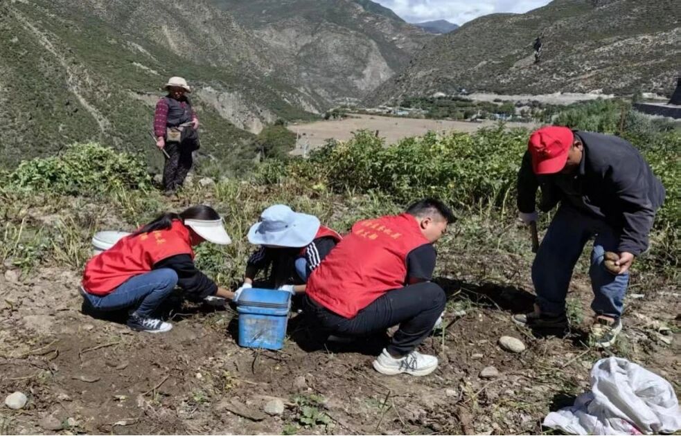 图为加查县纪委监委志愿者帮助村民采收土豆。