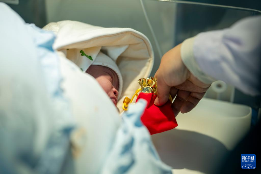 2026年1月1日,西藏自治区人民医院助产士赵粒给新生宝宝福袋。新华社记者 旦增尼玛曲珠 摄