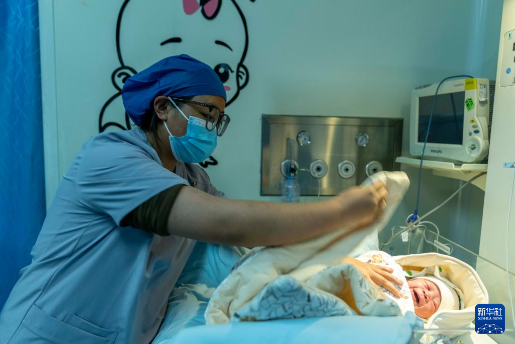 2026年1月1日,西藏自治区人民医院妇产科助产医生次拉在包裹新生儿。新华社记者 旦增尼玛曲珠 摄