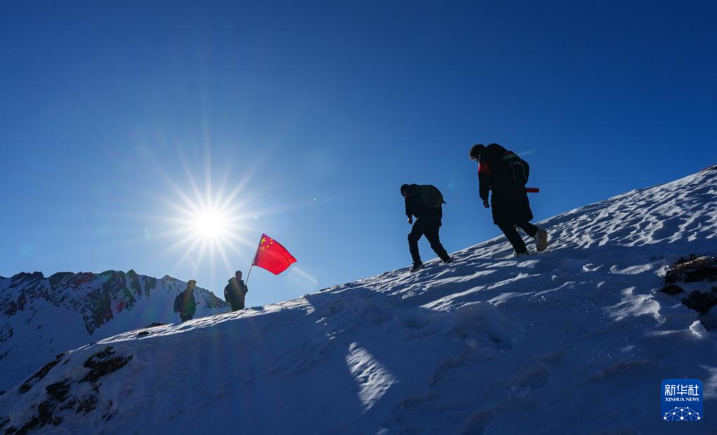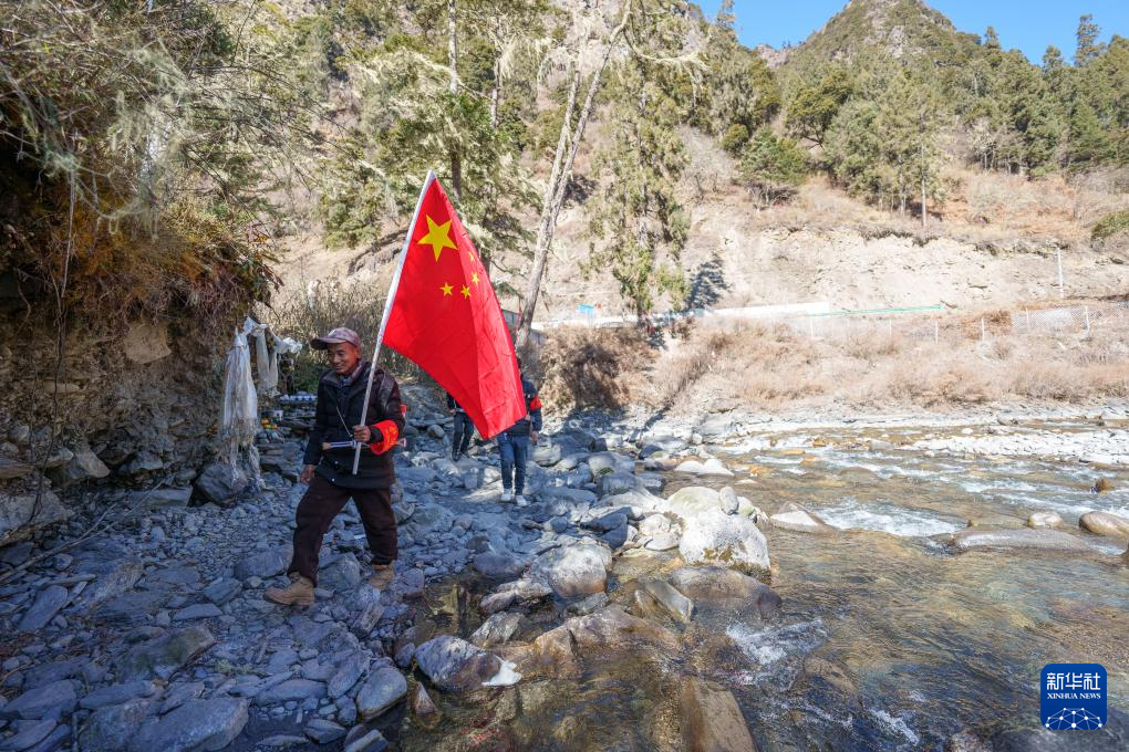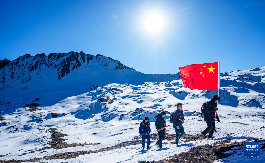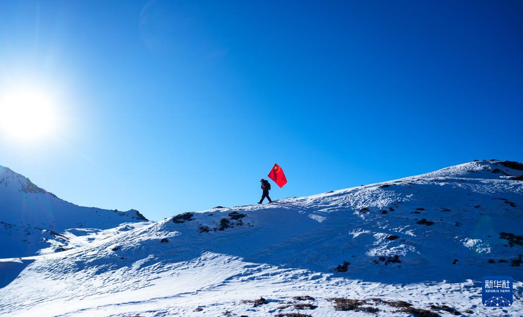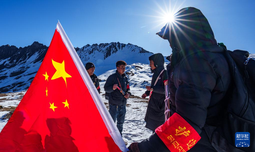 冬日时节,西藏山南市隆子县玉麦乡的群山覆盖着积雪。4名护边员晨光中行进在雪山间,50岁的普布罗布肩扛国旗,走在队伍最前面,索朗多吉、拉巴次仁、洛桑罗布紧跟其后。