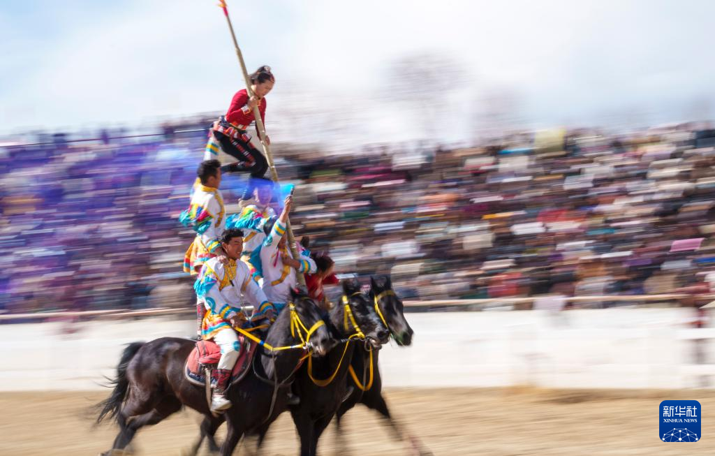 2月20日,马术队员在表演多人多马叠罗汉。新华社记者 丁增尼达 摄