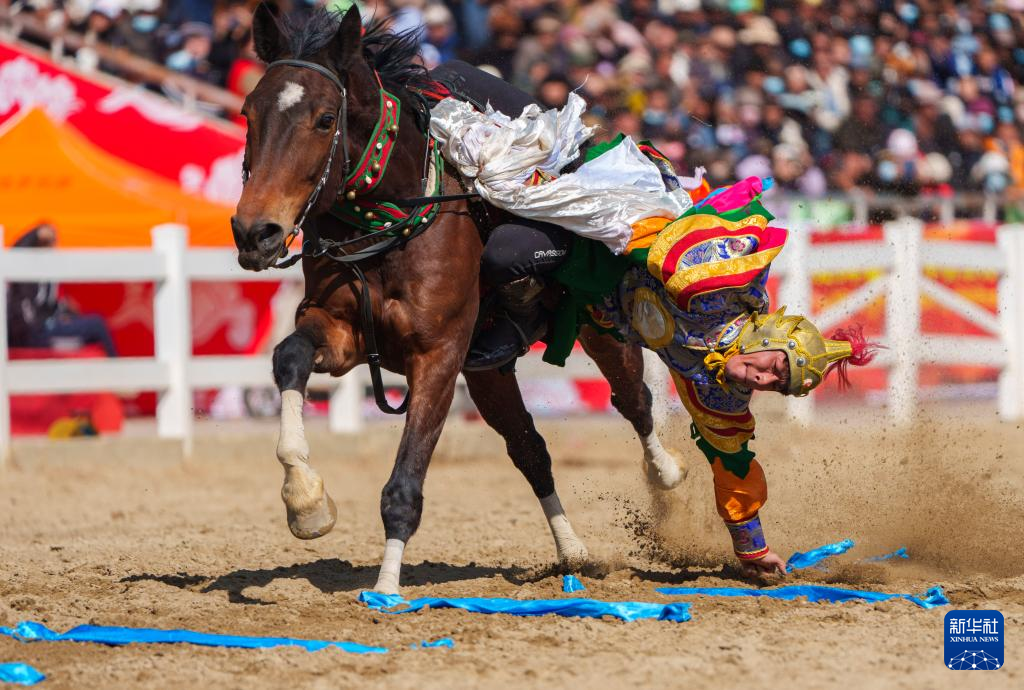 2月20日,马术队员在表演马上拾哈达。新华社记者 丁增尼达 摄