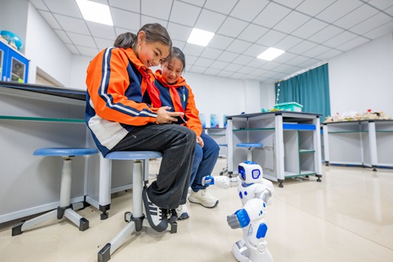 3月26日,学生在用编程完成机器人表演。新华网 旦增努布 摄