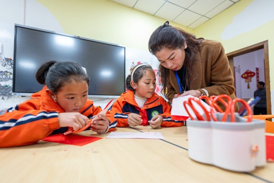 3月26日,学生在兴趣班上体验非遗剪纸。新华网 旦增努布 摄