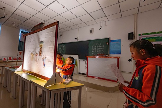 3月26日,学生在用自己亲手制作的皮影表演。新华网 旦增努布 摄