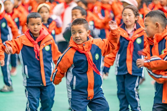 3月26日,学生在课间操跳民族舞。新华网 旦增努布 摄